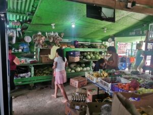 Einkaufen auf einer Insel ist nicht immer einfach, besonders dann, wenn – wie auf Guanaja – fast nichts lokal angebaut wird. Alles muss per Boot angeliefert werden, und dieses kommt nur einmal pro Woche, am Mittwochabend. Entsprechend sind am Donnerstag die Regale gut gefüllt, und alle Insulaner strömen auf das Cay zum Einkaufen. Eine ideale Gelegenheit, alle kennenzulernen. Schon wenige Tage später werden die Regale deutlich leerer. Man kann nur kaufen, was auf dem Schiff war, und das Angebot ist entsprechend begrenzt. War der Salat bei der Lieferung schon welk, gibt es eben eine Woche lang nur welken Salat.